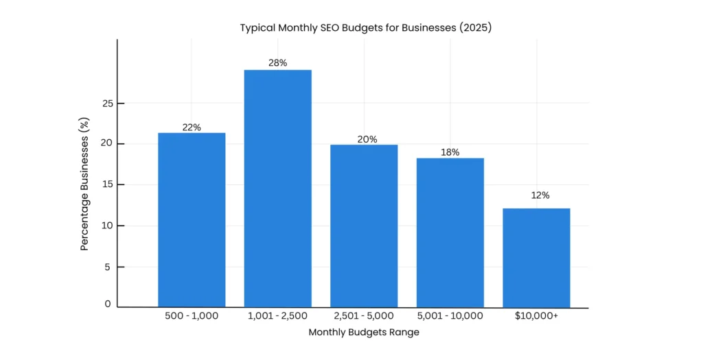 The chart below shows a typical distribution of monthly SEO budgets among businesses. A large share falls between the $1,001–$2,500 range, while some allocate more than $10,000/month for aggressive or large-scale campaigns.